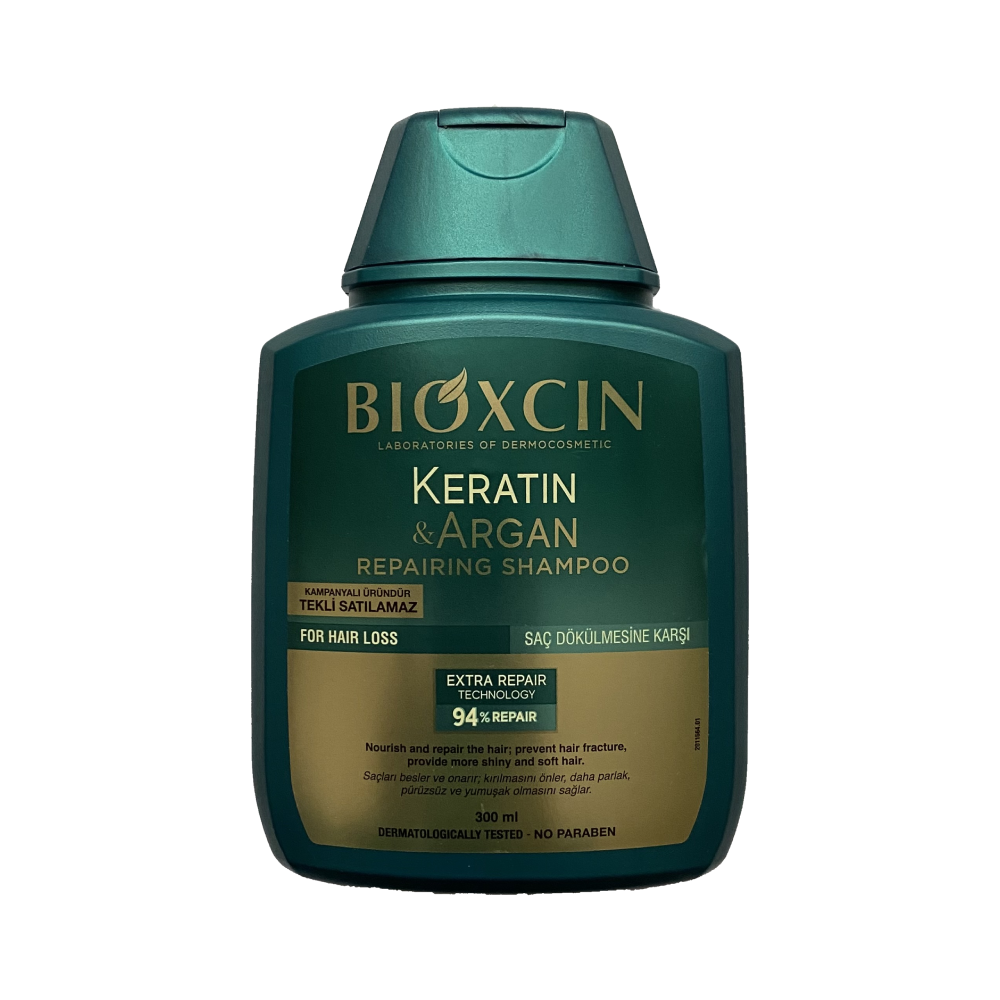 Bioxcin Keratin & Argan Repair Shampoo یکی از شامپوهای تخصصی برند بیوکسین است که برای بازسازی و ترمیم موهای آسیب‌دیده، خشک و شکننده طراحی شده است. این شامپو با ترکیبی از کراتین و روغن آرگان، تارهای مو را از ریشه تا ساقه تقویت می‌کند و باعث می‌شود موها نرم، براق و قابل کنترل شوند. استفاده مداوم از این شامپو موهای آسیب‌دیده را ترمیم کرده و به بهبود ساختار داخلی تار مو کمک می‌کند.